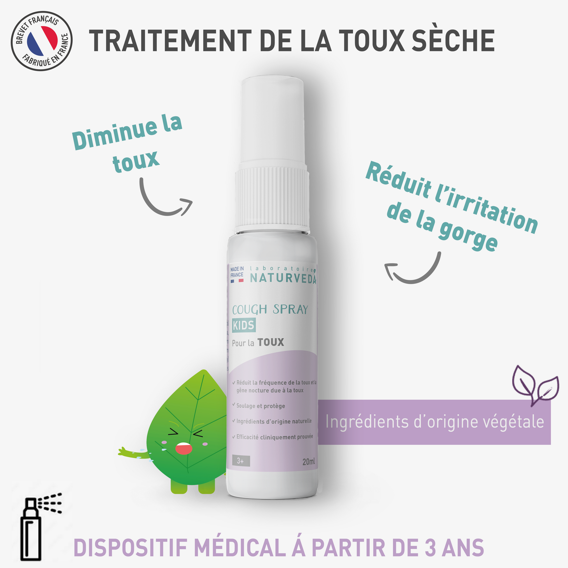 COUGH KIDS est un dispositif médical de classe IIa spécialement formulé pour soulager la toux sèche chez l'enfant à partir de 3 ans. Grâce à sa technologie polymère brevetée à base de glycérol filmogène, il agit mécaniquement pour réduire le réflexe de toux sans médicament.