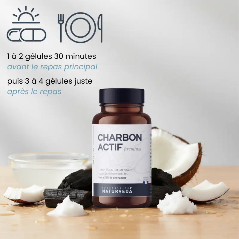 Prendre une partie du complément alimentaire avant le repas prépare le système digestif et limite l'accumulation des gaz dès le début de la digestion. Compléter après le repas avec le reste du charbon actif végétal permet d'adsorber les gaz produits pendant la digestion pour un confort maximal.